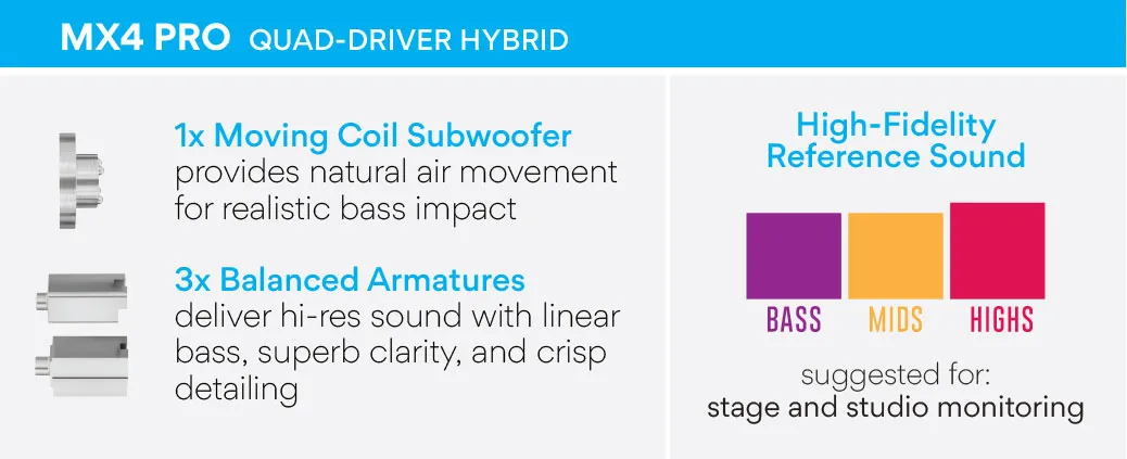 Flaggskeppet i vår MX PRO-serie, MX4 PRO använder en balanserad ljudinställning och upplösningen på fyra hörlurselement för att ge det ultimata inom high fidelity-referensljud för scen och studio.